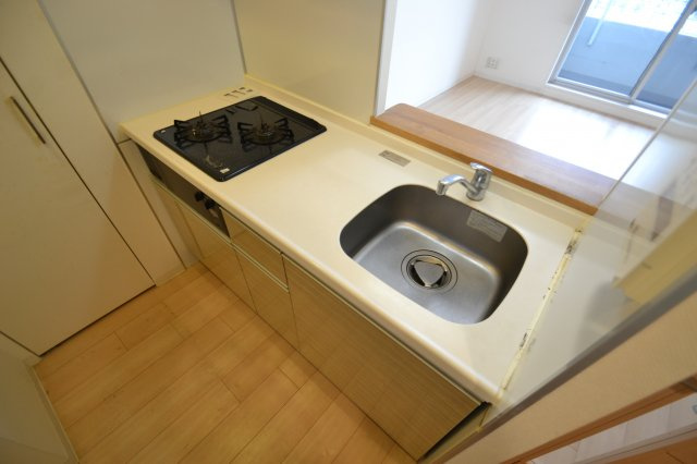 リビングが見渡せるシステムキッチンのご紹介です。人気のガスコンロ2口で調理スペースがしっかり確保されています。お料理好きの方にオススメしたいキッチンです。また収納もしっかりあるので、食器などが多い方も安心できる収納力がポイントです。