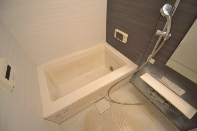 最後にバスルームです。まずは、この広々バスルームが嬉しいですね。設備も充実していて、追い炊き機能も標準装備です。多人数でご入居される方には嬉しい機能ですね。また、お風呂でテレビも見れちゃうのが贅沢です。こんなお風呂で一日の疲れを癒しちゃってください。