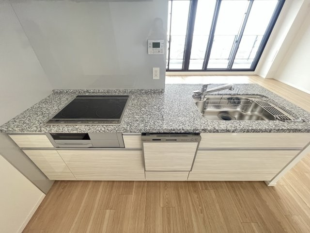 大理石基調の大きなカウンターキッチンです!シンクも広く調理スペースも広く・IHクッキングヒーター・グリル付きです。小さなお子様がいてもカウンターキッチンなので安心して料理ができます!